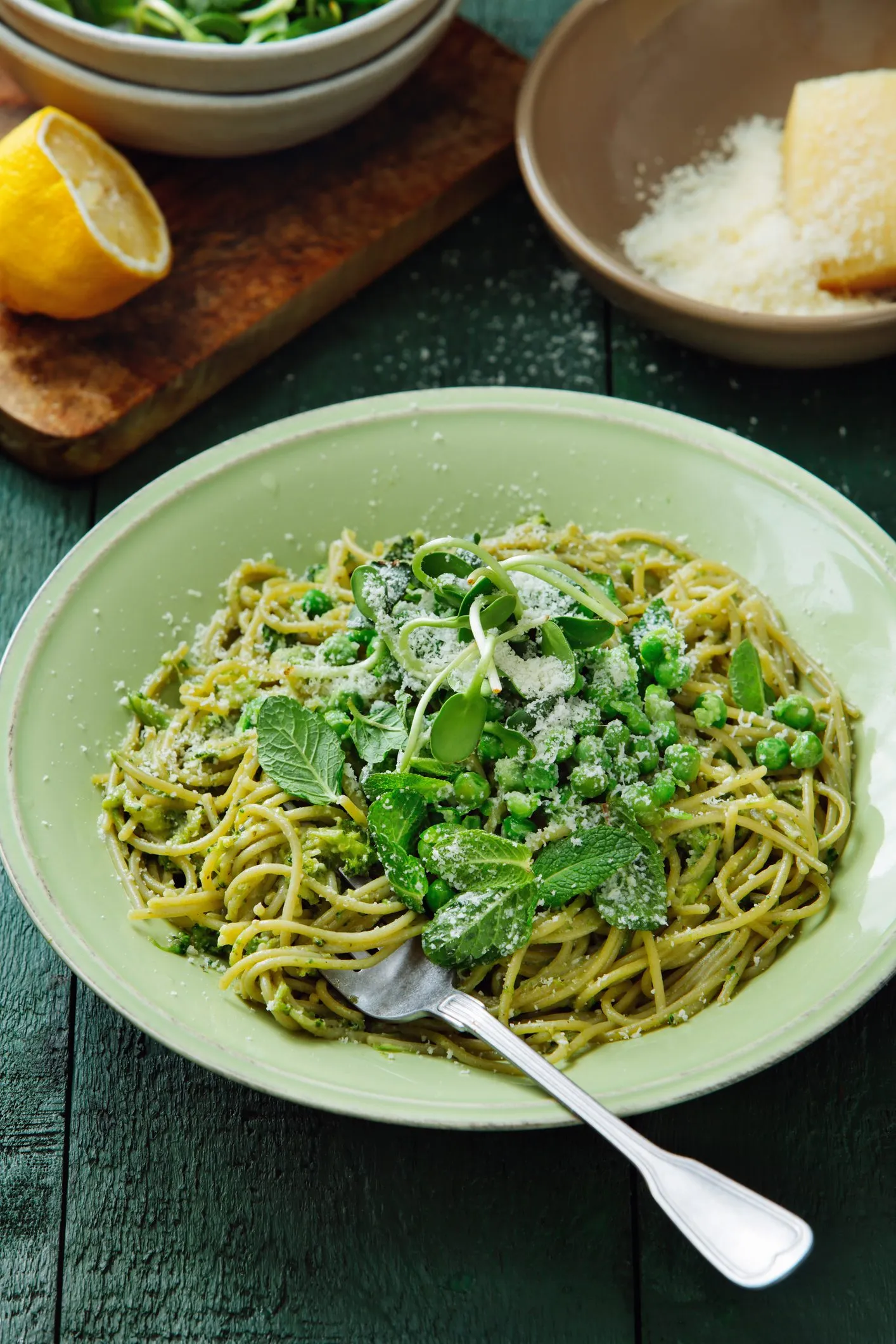 قدمي السباغيتي مع الكراث وصلصة الليمون في طبق، وزينيها بجبن البارميزان المبشور ورشيها برقائق الفلفل الأحمر إذا رغبت في ذلك.