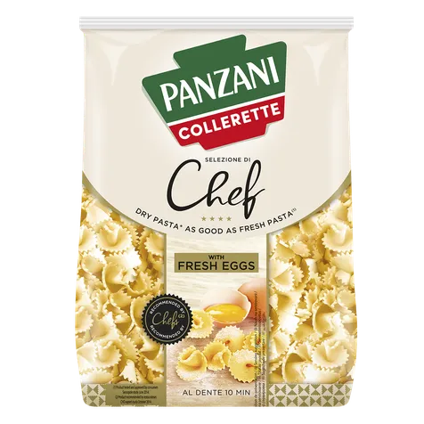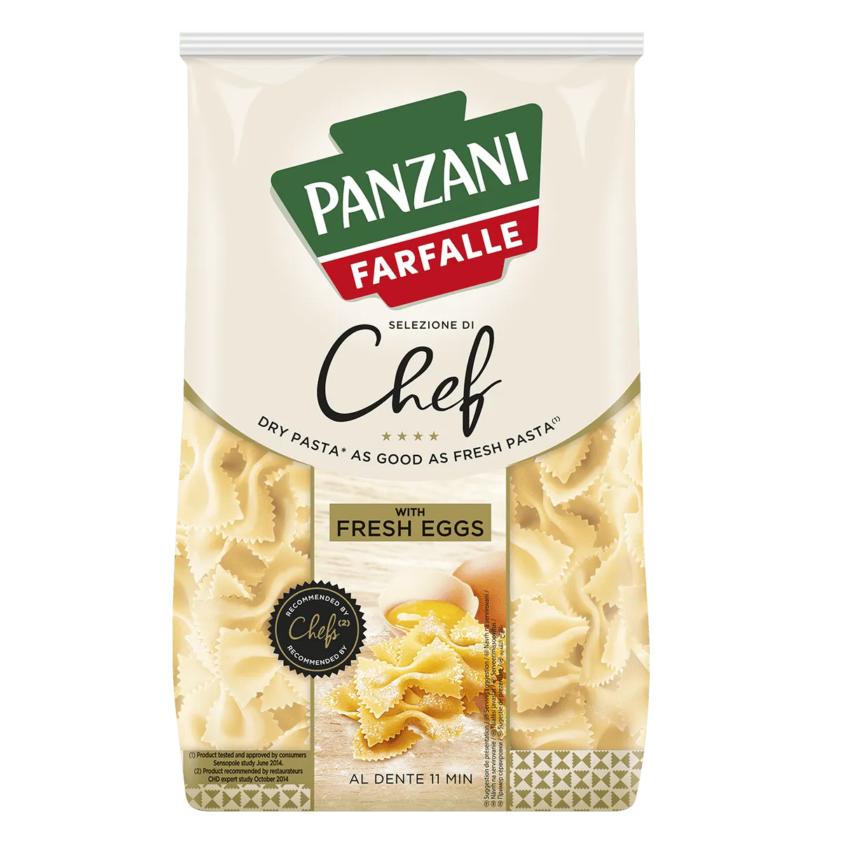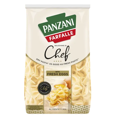 تم ابتكار معكرونة فارفالّي من مجموعة Selezione di Chef من بانزاني لمنحك تجربة طهي استثنائية. بفضل شكلها الرقيق على شكل فراشات، فإنها تضيف لمسة جميلة إلى أطباقك مع نكهتها الغنية وقوامها المتماسك الذي يذوب في الفم. تمتزج هذه المعكرونة بشكل مثالي مع الصلصات الشهية أو مع الخضار، فهي مثالية لتناول وجبات ممتعة ولذيذة مع الأصدقاء والعائلة. استمتع بأطباق سهلة التحضير ورائعة المذاق.